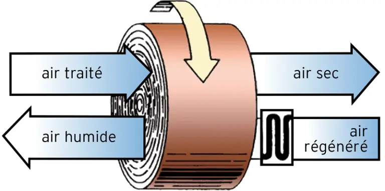 Aujourd’hui, la plupart des déshumidificateurs possèdent un “rotor” formé par des couches de feuilles plates et ondulées recouvertes avec des matériaux desséchants. Lorsque l’air passe à travers les canaux du rotor, l’humidité est transférée à la matière dessiccative.